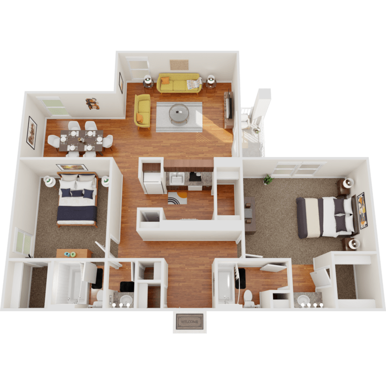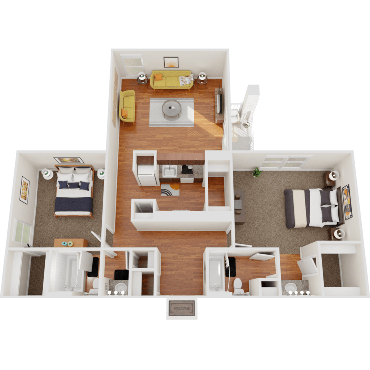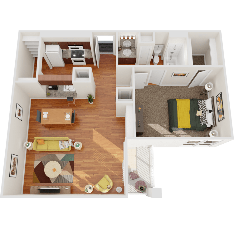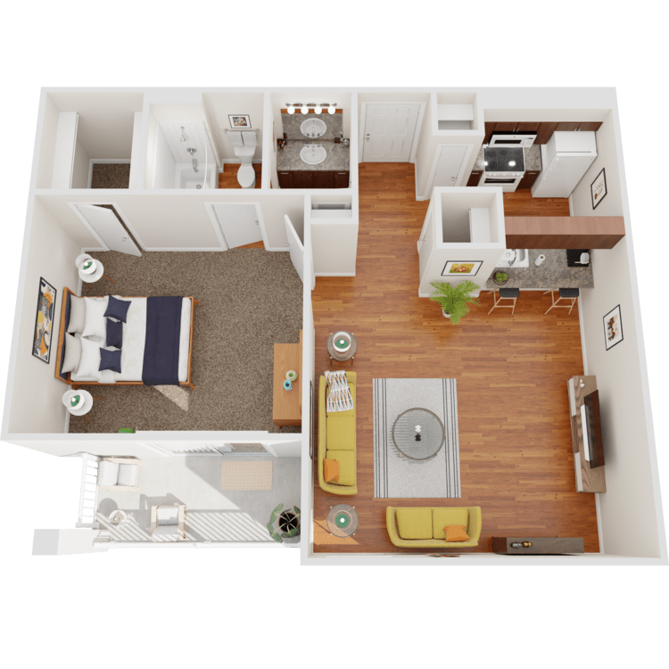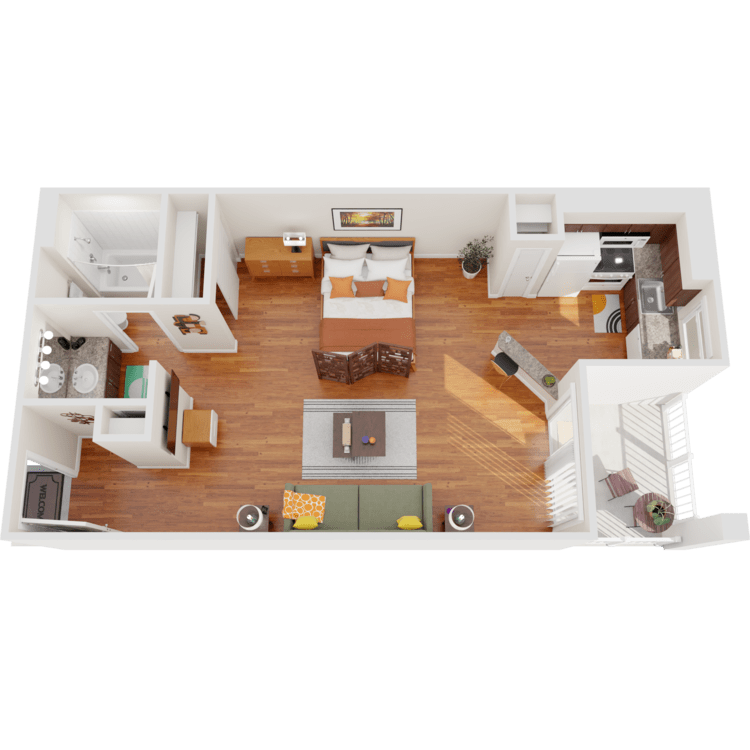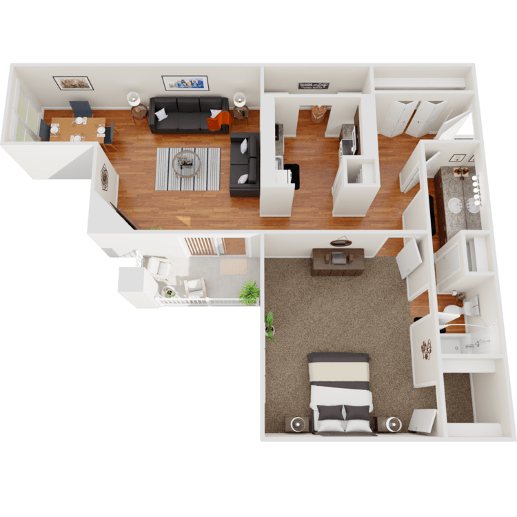 With six floor plans to choose from, we have something for everyone. Our stylish studio, one, and two-bedroom apartments for rent feature upgraded hardware and personal balconies and patios. Select homes feature designer countertops with backsplashes, wood-burning fireplaces, walk-in closets, hardwood floors, and washer and dryer connections. Feel at home from the moment you walk through the door.
